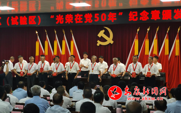 在慶“七一”表彰大會上,全體參會黨員面對鮮紅的黨旗,高舉右手,重溫入黨誓詞,鏗鏘嘹亮的宣誓聲響徹會場,激蕩人心,昭示著全區(qū)黨員矢志不渝為黨和人民事業(yè)不懈奮斗的堅定信念。會上,為高劍村黨支部等10個先進(jìn)基層黨組織、王開昌等10名優(yōu)秀黨務(wù)工作者、王天蒼等20名優(yōu)秀共產(chǎn)黨員代表分別頒發(fā)了榮譽證書,為“光榮在黨五十年”的10名老黨員代表頒發(fā)了紀(jì)念章。