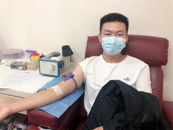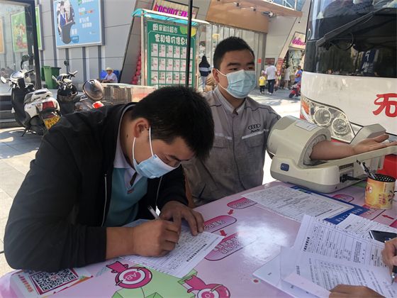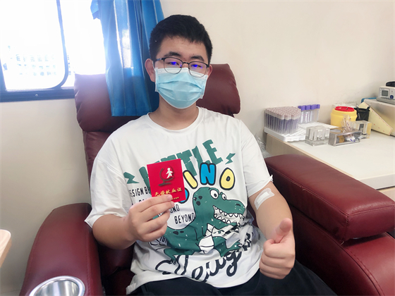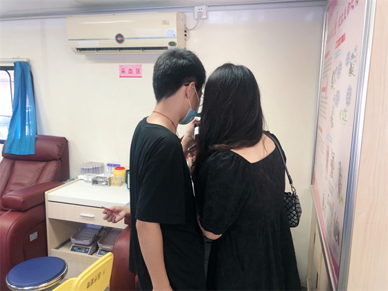 中秋節(jié)不僅街上熱鬧,獻血車上也熱鬧,鄧孟杰正坐在采血椅上獻血,他漂亮大方的女友站在旁邊跟他聊著晚上要吃什么,女友的弟弟坐在遠一點的地方玩著手機,女友的媽媽則坐在體檢桌前測量血壓,“一人獻血,三人陪同”的場景著實有點可愛,但鄧孟杰笑得十分開心,一直想獻血的他特別選了中秋這個日子,大概也是想和愛人親人一起分享這種美妙的人生體驗。鄧孟杰的女友拿起他的獻血證撒嬌到:“這次我們陪你,下次你也要陪我來獻血。”說完把手機塞給了一旁的弟弟,指揮他給自己和男友拍合照,一邊打趣弟弟拍照技術(shù)不好一邊把男友手里獻血證的位置調(diào)了又調(diào)。