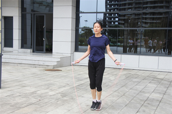 雙人項(xiàng)目考驗(yàn)的是默契度和耐力,不少組合也亮點(diǎn)紛呈,有面對面跳的,有側(cè)身對面跳的,還有背對著跳的,不管姿勢如何,共同的節(jié)奏是保持勝利的關(guān)鍵,當(dāng)然雙人跳到最后還得拼體力,不少選手氣息節(jié)奏被打亂,但大家都咬牙堅(jiān)持,沒人選擇放棄,哪怕絆亂了繩子一次次重來也要堅(jiān)持到最后一秒,周圍同事也不斷為場上選手加油鼓勁,氣氛相當(dāng)熱烈。