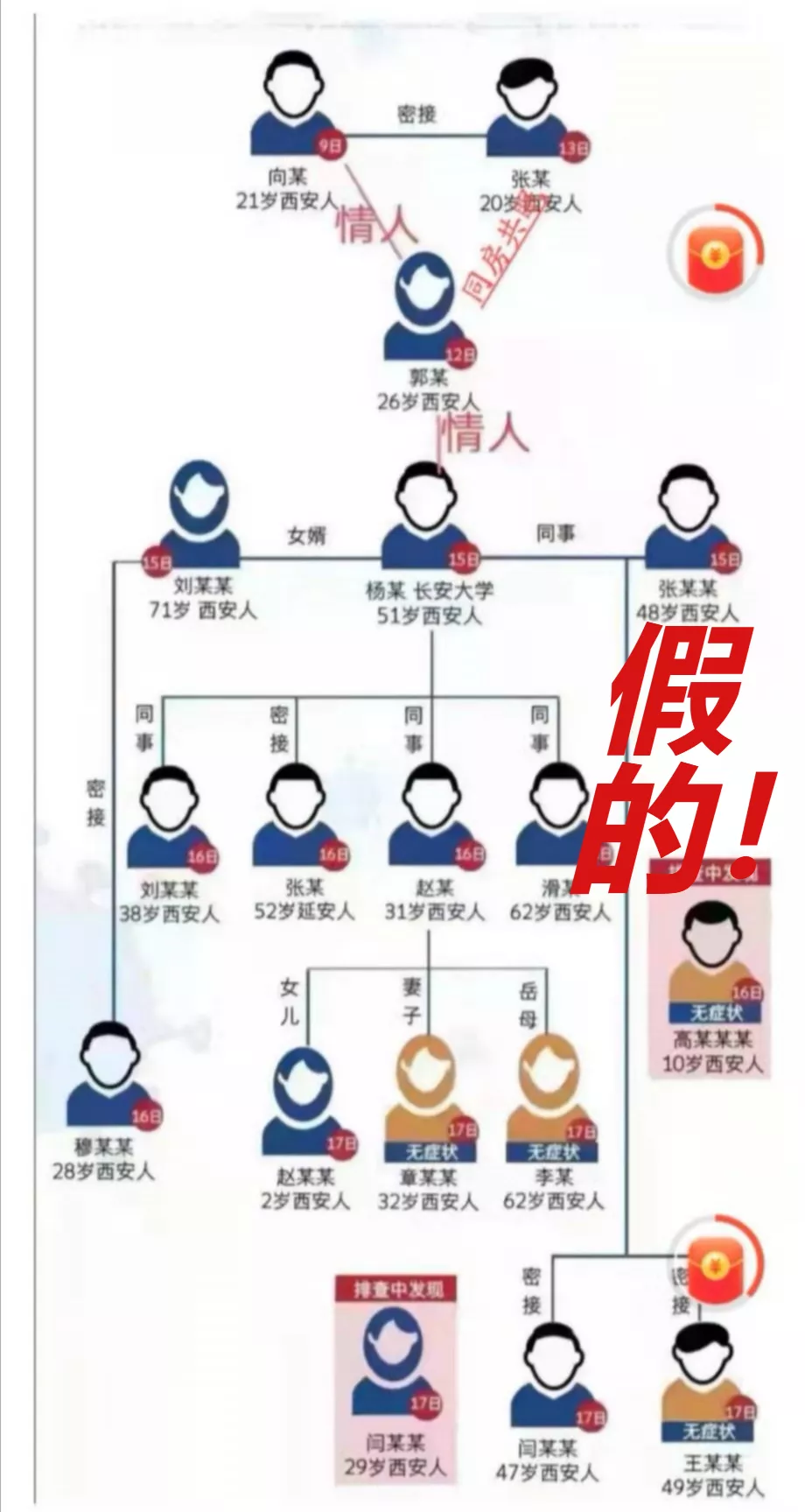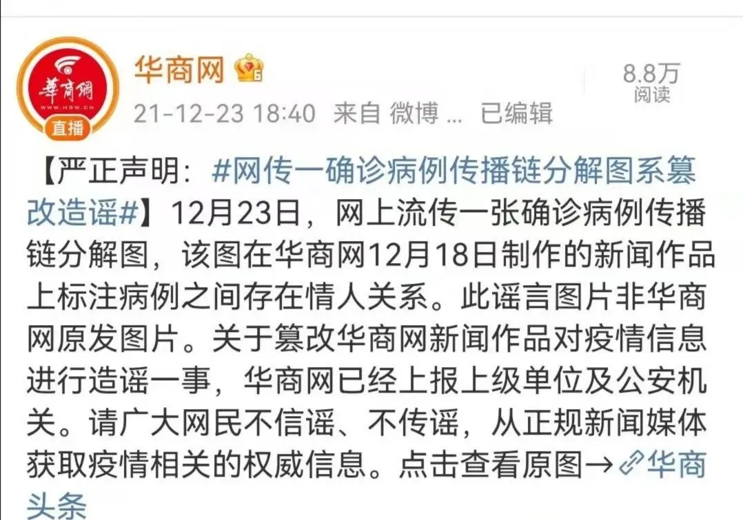網(wǎng)上流傳一張確認病例傳播鏈分解圖,在病例之間標注“情人”關系,并傳言此次疫情傳播因素之一,是因為西安首例病例與子牛門診的護士為情人關系,導致疫情擴散,經(jīng)核實,該圖盜用華商網(wǎng)12月18日制作的新聞作品圖片。該信息為虛假信息,造謠的人已被拘留。