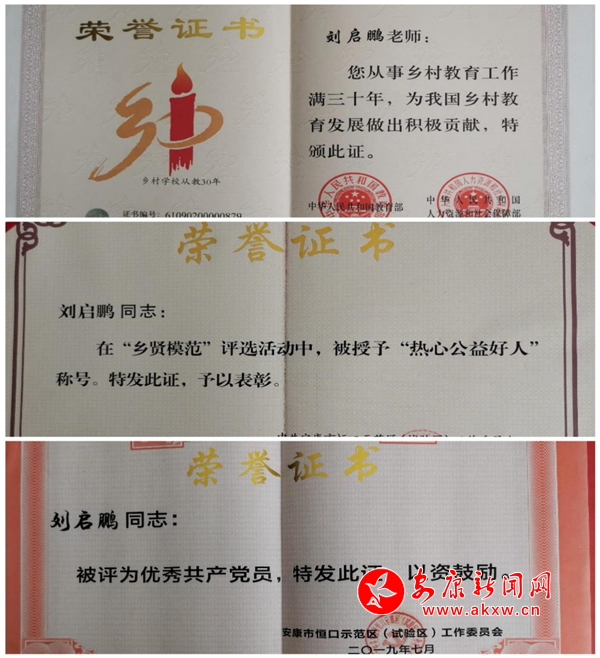 劉啟鵬先后獲得教育部、人力資源和社會保障部授予“鄉(xiāng)村學(xué)校從教30年”榮譽證書,被區(qū)鎮(zhèn)評為“鄉(xiāng)賢模范”和“優(yōu)秀共產(chǎn)黨員”等先進個人。