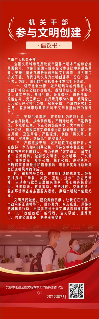 全國文明城市是反映城市整體文明水平的綜合類榮譽稱號,也是目前國內(nèi)城市綜合類評比中的最高榮譽。安康目前正在積極爭創(chuàng)全國文明城市,作為我市機(jī)關(guān)干部,有責(zé)任和義務(wù)為文明創(chuàng)建盡一份心、出一份力。為此,我們向全體機(jī)關(guān)干部發(fā)出如下倡議: