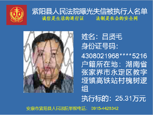 曝光失信 | 紫陽縣人民法院:關(guān)于敦促呂賢毛履行法定義務(wù)的公告
