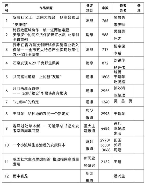 按照省記協(xié)要求,特將推薦參評2022年度陜西新聞獎初評的作品予以公示。公示期為2023年2月13日至2月17日,在此期間內如有異議請向新聞管理部反饋。報送作品如下:?