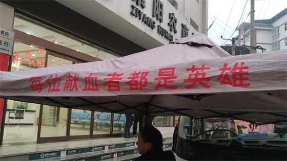 獻(xiàn)血車下的體檢棚子上寫著這樣一句話:每位獻(xiàn)血者都是英雄。