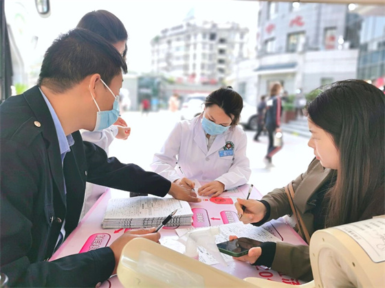 早上9點(diǎn),列隊(duì)等候的醫(yī)務(wù)工作者們?cè)讷I(xiàn)血車(chē)前,井然有序的進(jìn)行信息登記、健康征詢、血壓測(cè)量等程序。他們中有多次獻(xiàn)血的“老兵”,也有首次獻(xiàn)血的年輕職工,有的剛下夜班,有的趁工作間隙,還有的則放棄了休息趕來(lái)。大家紛紛表示,無(wú)償獻(xiàn)血就是以實(shí)際行動(dòng)踐行廣大醫(yī)護(hù)人員的初心使命,為老百姓的生命健康保駕護(hù)航。