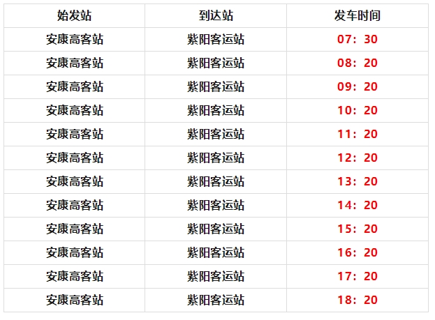由紫陽(yáng)客運(yùn)站發(fā)往安康高速客運(yùn)站,每日12班,發(fā)車(chē)時(shí)間為: