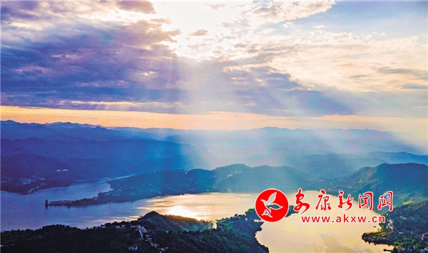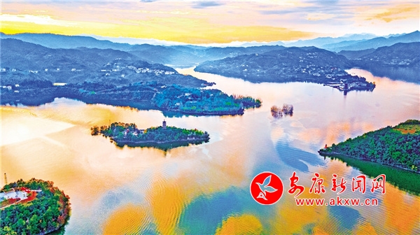 夕陽(yáng)西下,陽(yáng)光揮灑在瀛湖水面,美不勝收。