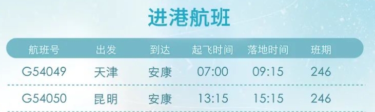 12月26日起,安康富強(qiáng)機(jī)場(chǎng)新增“安康=昆明”“安康=天津”航線(xiàn)。具體航線(xiàn)航班如圖: