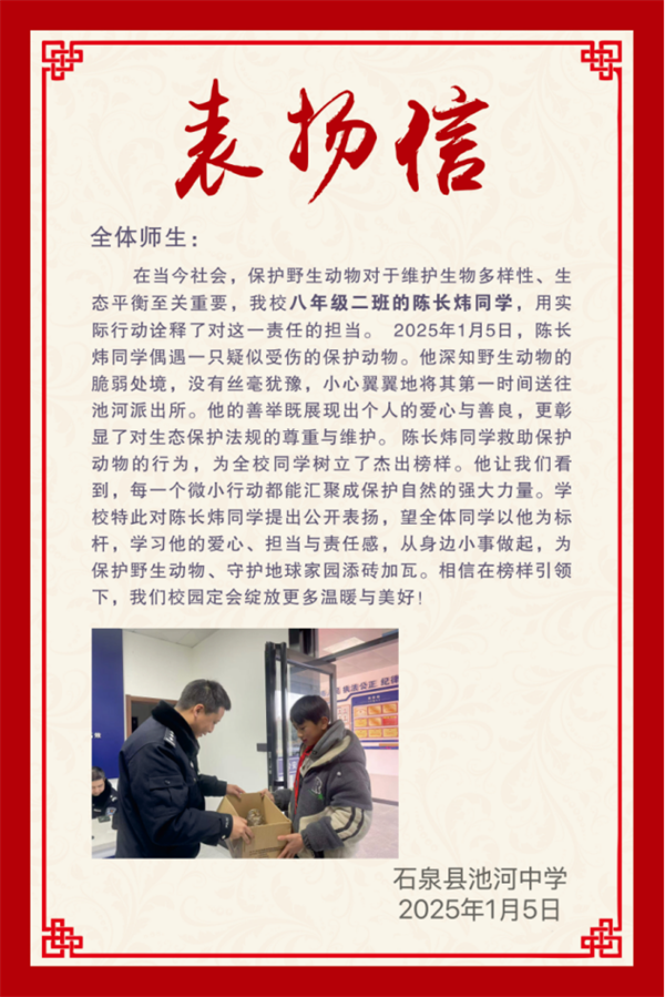 陳長煒的暖心事跡傳到學(xué)校后,學(xué)校發(fā)布了表揚信,公開表揚陳長煒同學(xué)的愛心善舉和保護(hù)野生動物的暖心行為。號召全體學(xué)生要學(xué)習(xí)陳長煒的愛心、責(zé)任和擔(dān)當(dāng),從小事做起,從自身做起,保護(hù)野生動植物,為保護(hù)地球家園、尊重生態(tài)文明的多樣性貢獻(xiàn)力量。?