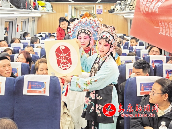 火車穿越秦巴山水間,途中,來自安康漢調(diào)二黃研究院的專業(yè)演員和地方民間漢調(diào)二黃愛好者們一同表演了國家級非物質(zhì)文化遺產(chǎn)——漢調(diào)二黃經(jīng)典戲曲演唱,并為旅客們講解漢調(diào)二黃戲曲知識,與旅客們開展互動交流,讓旅客親身體驗(yàn)漢調(diào)二黃戲服道具,感受漢調(diào)二黃的獨(dú)特藝術(shù)魅力。來自漢濱區(qū)文化館的漢濱剪紙技藝傳承人為旅客們展示講解了安康市級非物質(zhì)文化遺產(chǎn)——漢濱剪紙技藝,向參與互動的旅客送上了親手創(chuàng)作的漢濱剪紙作品,提前送上新春祝福?;顒又校靼茶F路公安局安康公安處的民警們和文藝工作者們一同宣傳普及了反詐知識,進(jìn)一步提升旅客的安全防范意識。