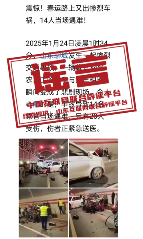 真相:近日,有網(wǎng)民在網(wǎng)絡(luò)平臺發(fā)布一則“山東聊城一隧道內(nèi)發(fā)生多車相撞”的信息,稱“現(xiàn)場多車發(fā)生嚴重碰撞,場面慘烈,群眾滯留”,引發(fā)關(guān)注。經(jīng)當(dāng)?shù)鼐胶藢?,山東省聊城市從未發(fā)生過類似交通事故,該信息內(nèi)容純屬虛假編造。經(jīng)查,網(wǎng)民褚某某和韓某為博取關(guān)注、吸引流量,將外省市發(fā)生交通事故的圖片視頻移花接木,稱“聊城發(fā)生交通事故”并憑空捏造傷亡人數(shù),造成不良影響。目前,二人已被公安機關(guān)依法打擊處理。(來源:山東互聯(lián)網(wǎng)聯(lián)合辟謠平臺、聊城市網(wǎng)上辟謠平臺)