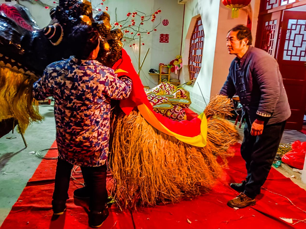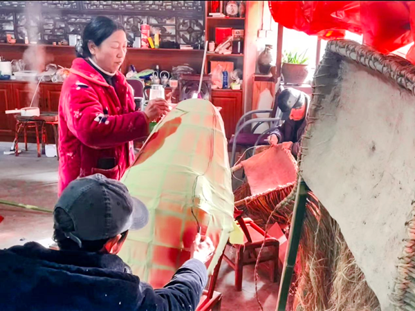 “龍頭是整條龍的重點(diǎn),刻畫(huà)要逼真,色彩還得鮮艷。忙碌了一年的鄉(xiāng)親們,就希望在正月里,抖擻精神,舞動(dòng)起來(lái)?!闭f(shuō)話(huà)間,李忠寶一雙巧手上下翻飛,正在修剪龍頭花燈的胡須,忙得額頭沁出了汗珠。兒子李石磊則忙著幫烤、粘、填、糊、上色……在他們父子倆的精雕細(xì)琢下,一個(gè)威風(fēng)凜凜、栩栩如生的花燈道具龍頭,總算扎制完成。