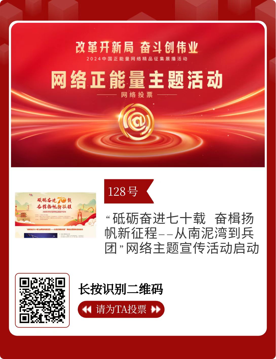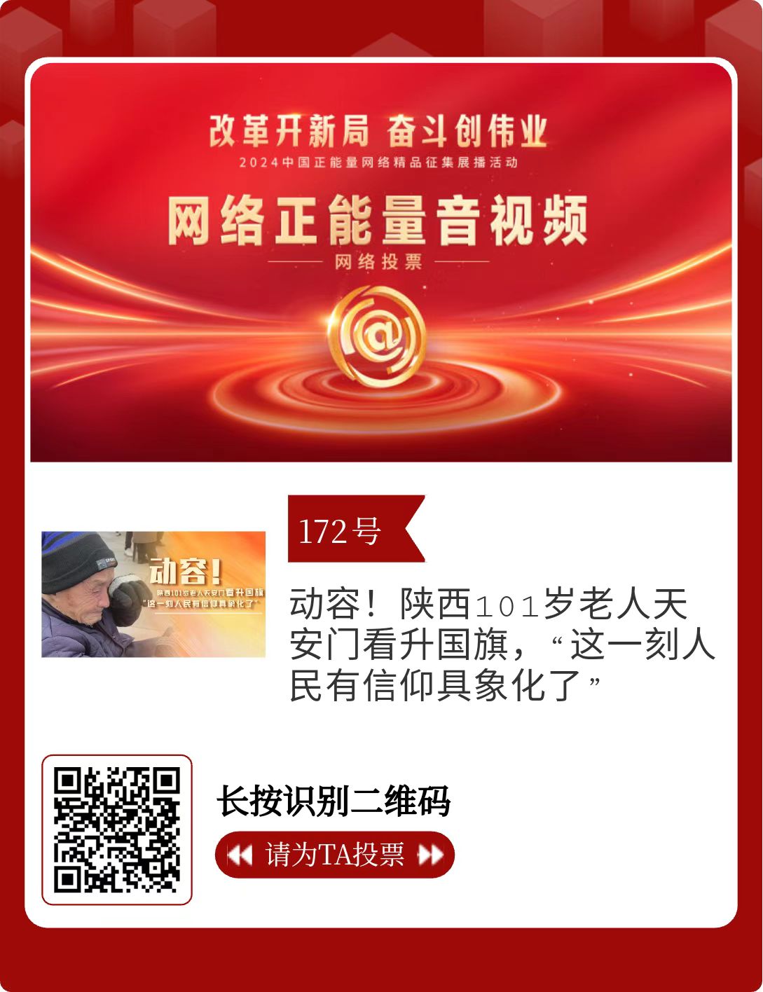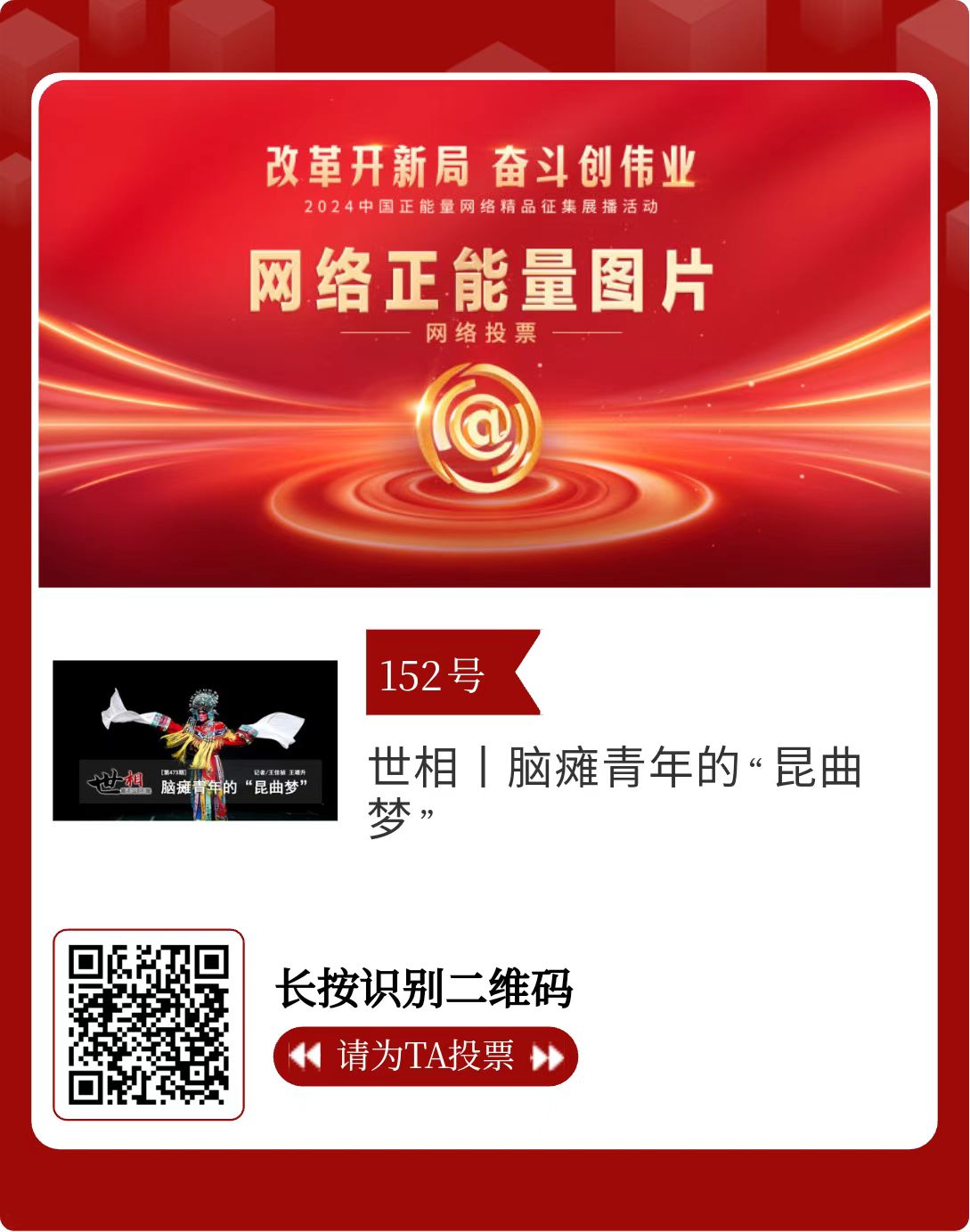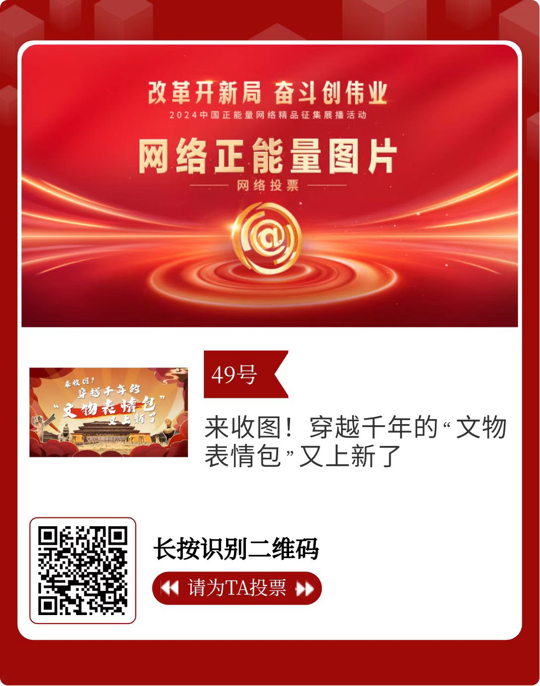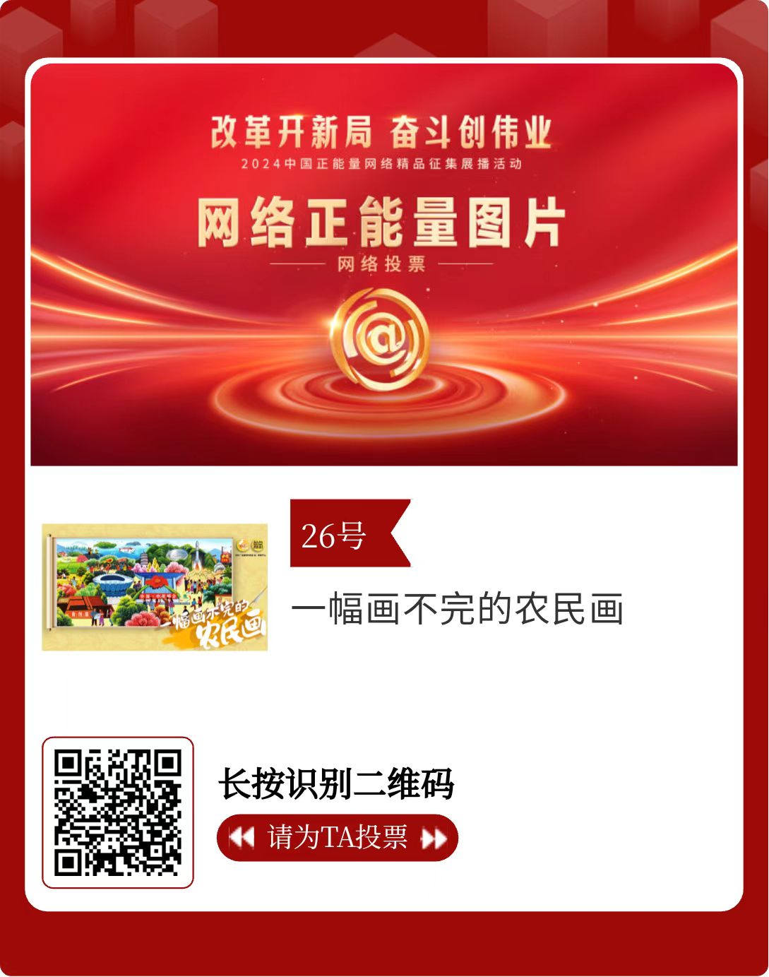 改革開新局,奮斗創(chuàng)偉業(yè)。由中央網信辦主辦的2024中國正能量網絡精品征集展播活動今天啟動網絡展播投票。