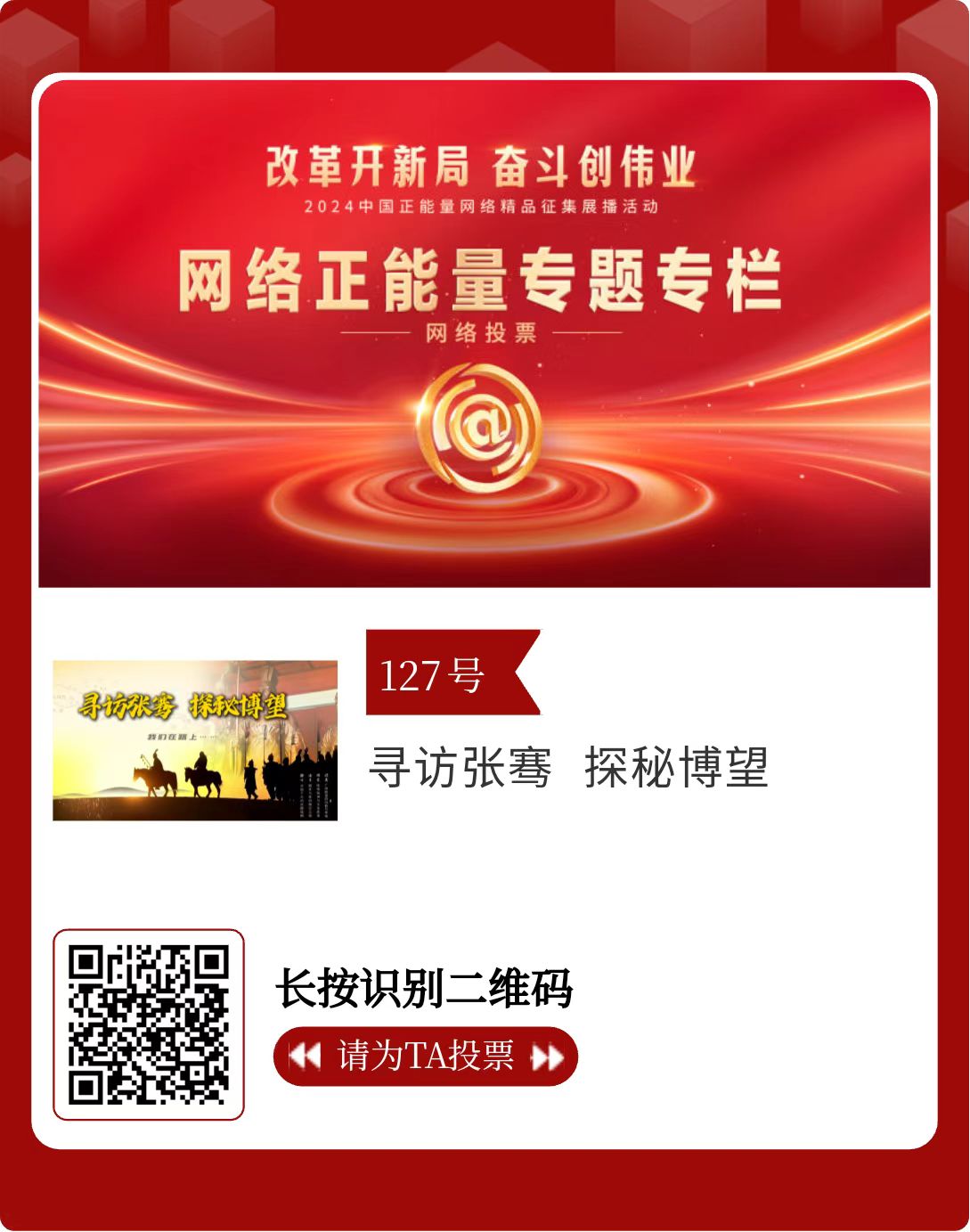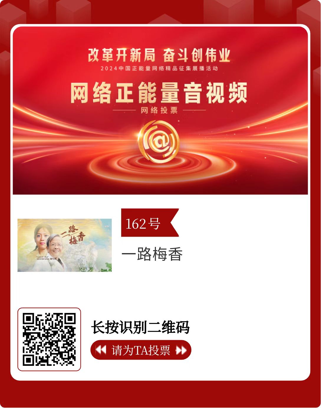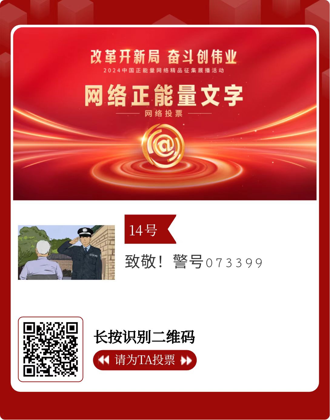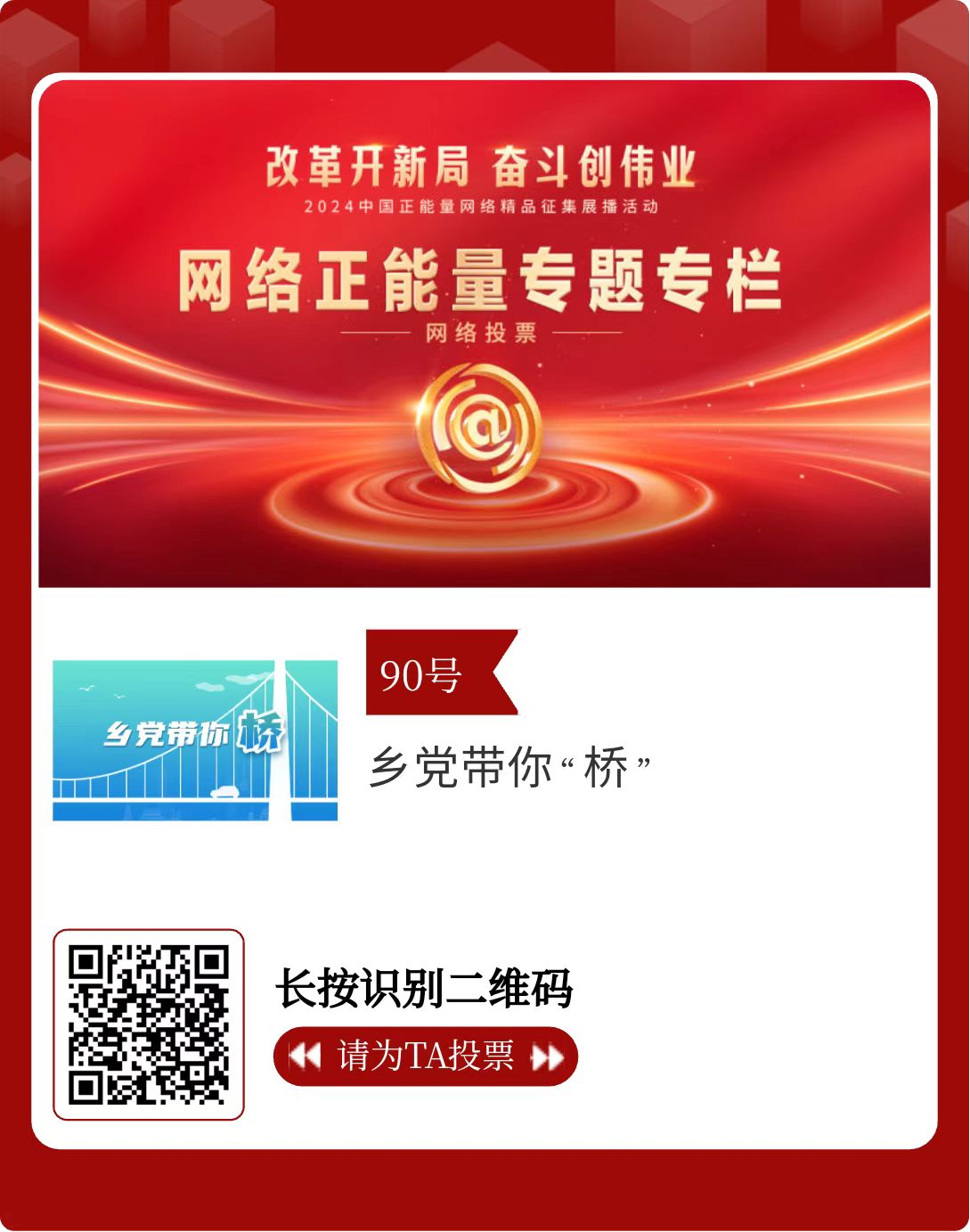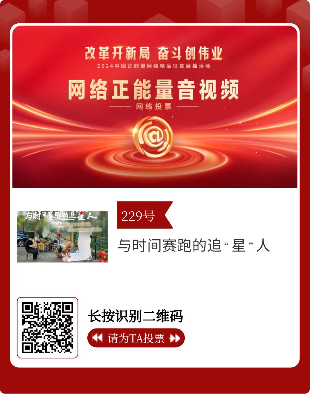 改革開新局,奮斗創(chuàng)偉業(yè)。由中央網信辦主辦的2024中國正能量網絡精品征集展播活動今天啟動網絡展播投票。