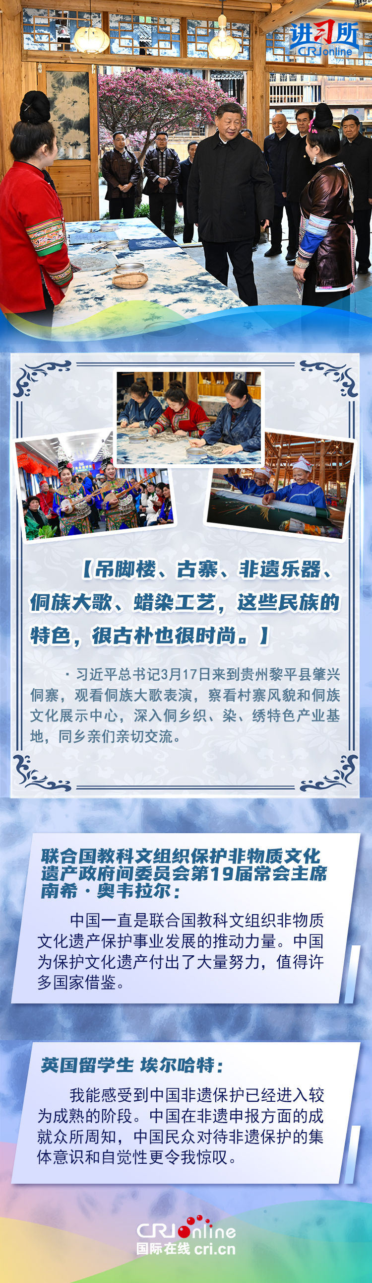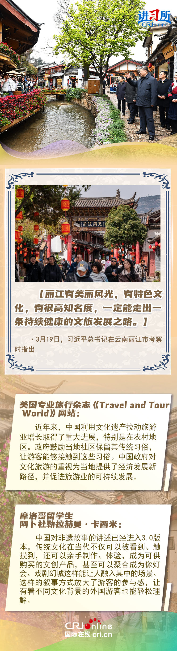 習(xí)近平總書(shū)記近日赴貴州、云南考察。他走進(jìn)民族特色村寨、歷史文化古城,心系歷史文化遺產(chǎn)保護(hù)和文旅融合發(fā)展。習(xí)近平特別叮囑當(dāng)?shù)毓賳T和群眾,既要保護(hù)有形的村落、民居、特色建筑風(fēng)貌,傳承無(wú)形的非物質(zhì)文化遺產(chǎn),又要推動(dòng)其創(chuàng)造性轉(zhuǎn)化、創(chuàng)新性發(fā)展。
