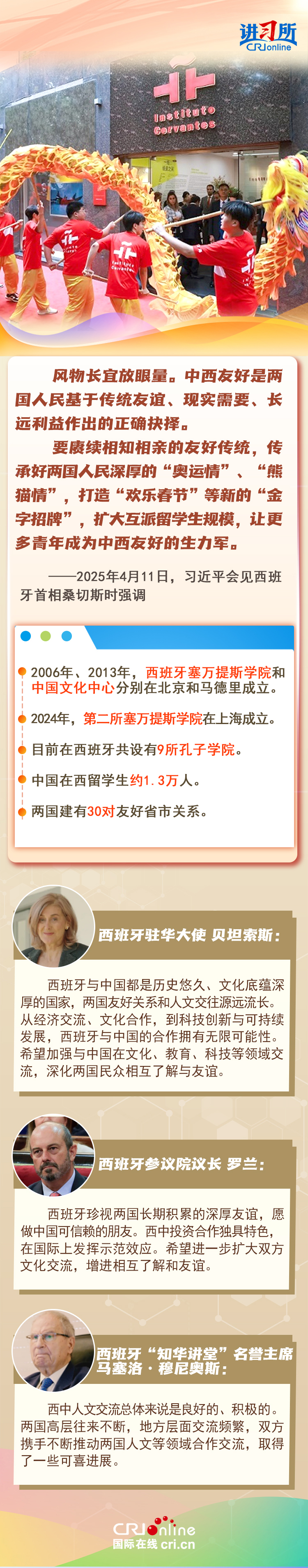 今年是中西全面戰(zhàn)略伙伴關(guān)系建立20周年,也是中歐建交50周年。多年來,中西兩國領(lǐng)導(dǎo)人保持密切互動,秉持互尊互信、互利共贏精神,兩國在深化貿(mào)易、投資、科技創(chuàng)新、綠色能源等領(lǐng)域取得豐富合作成果,雙邊關(guān)系走在中國同歐洲國家關(guān)系前列。在西班牙人士眼中,良好的對華關(guān)系對西班牙、歐洲和世界具有重要意義,將會為兩國人民帶來更多實實在在的福祉,也將共同創(chuàng)造更美好的未來。