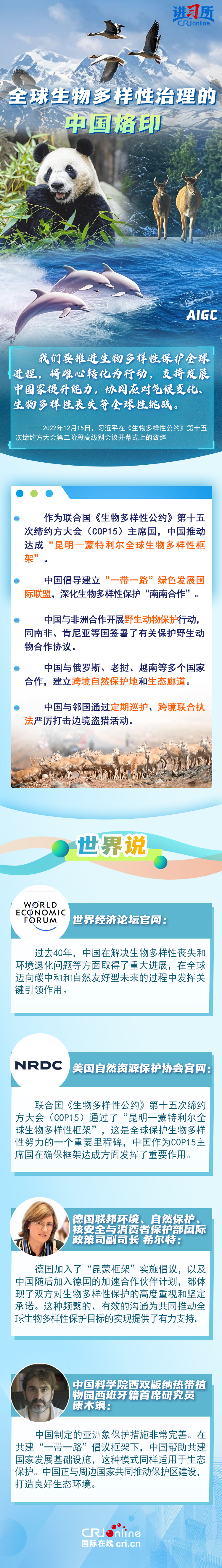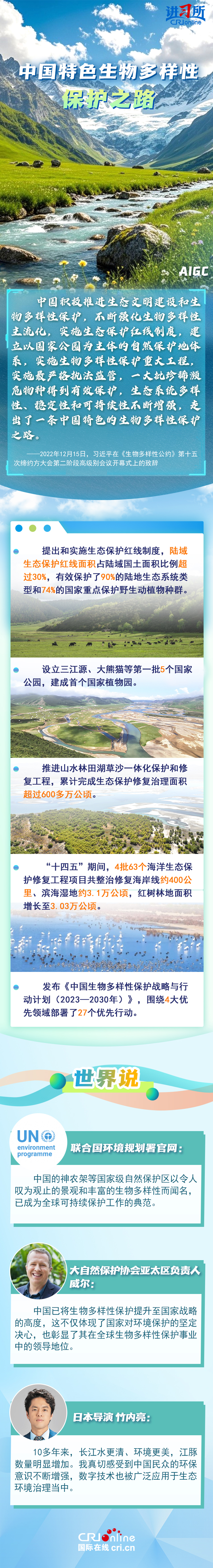 “心往一處想、勁往一處使,共建地球生命共同體?!弊鳛樽钤绾炇稹⑴鷾?zhǔn)《生物多樣性公約》的締約方之一,生物多樣性保護(hù)已經(jīng)上升為中國的國家發(fā)展戰(zhàn)略。國際人士表示,中國的一系列舉措體現(xiàn)出對(duì)生態(tài)環(huán)境保護(hù)的堅(jiān)定決心,同時(shí),中國依托共建“一帶一路”倡議等國際合作機(jī)制,為推動(dòng)全球生物多樣性保護(hù)提供了有力支持,在邁向自然友好型未來的過程中發(fā)揮關(guān)鍵的引領(lǐng)作用。