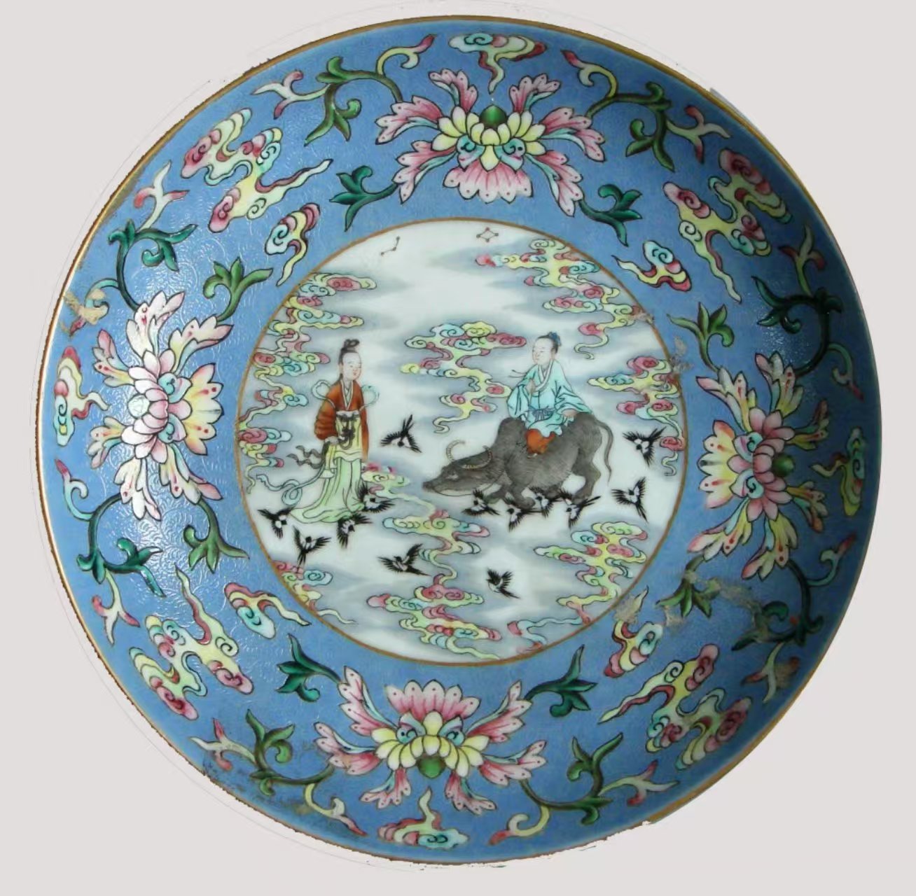 北京藝術(shù)博物館收藏的清代景德鎮(zhèn)官窯粉彩人物圖盤,就像一幅流動(dòng)的七夕畫卷。此盤工藝精湛,口沿涂金,熠熠生輝,盡顯皇家氣派。盤內(nèi)外壁采用“粉彩軋道”工藝,天藍(lán)釉地上淺淺的卷草紋似微風(fēng)輕拂,粉彩花卉與朵云紋相互映襯,如夢(mèng)如幻。盤內(nèi)底描金圓形開光處,粉彩繪就的人物故事圖案更為生動(dòng):牛郎坐于牛背,手握韁繩,深情凝望;織女身姿婀娜,嬌羞回望,二人似在互訴衷腸。背景中祥云繚繞、星辰閃爍、鵲鳥紛飛,為這場相會(huì)營造了浪漫的氛圍。外底“鵲橋仙渡”四字,點(diǎn)明主題。
