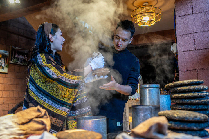 2024年4月13日,一名俄羅斯塔斯社記者(右)在大理市體驗包裝下關沱茶。據統計,2025年1月至6月,云南省接待入境過夜游客251.03萬人次,同比增長86%。