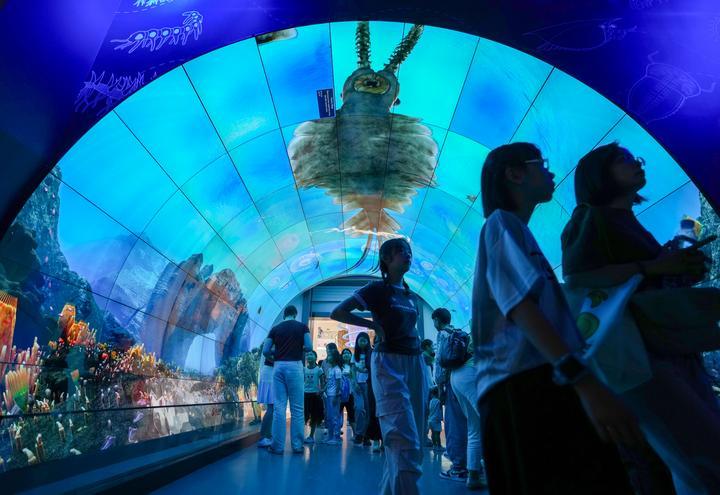 025年7月15日,游客在玉溪市澄江化石地世界自然遺產博物館“寒武紀海底隧道”參觀。
