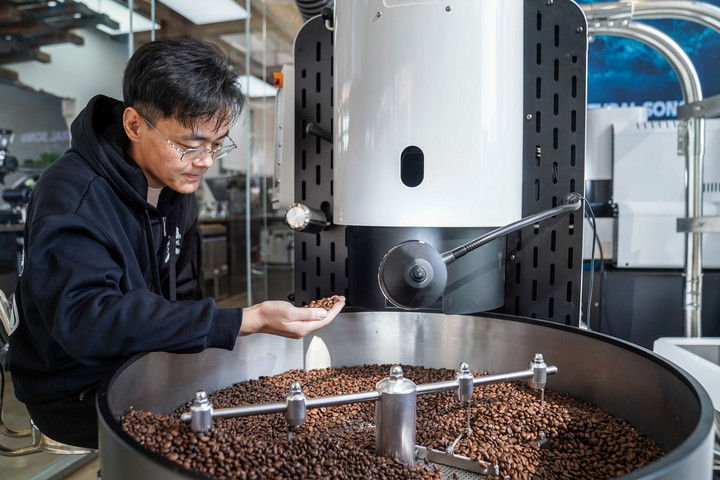 ? ? ? ? ? ? ? ? ? ? ? ? ? ? 2025年12月10日,韓君瑋在位于昆明的南來盛咖啡店內烘焙咖啡豆。