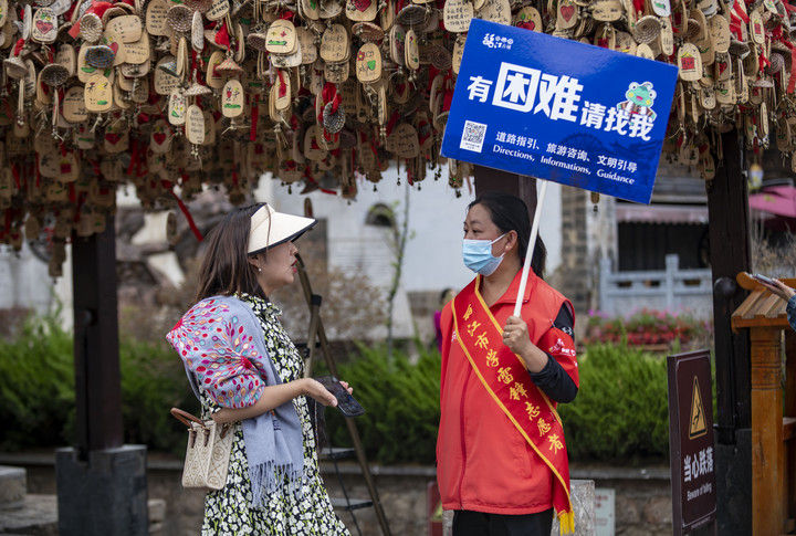 2023年5月18日,一名游客(左)在麗江古城向志愿者咨詢。2015年12月,云南麗江古城保護管理局牽頭成立了麗江古城旅游志愿者服務隊,志愿者主要來自市區(qū)機關單位、古城保護管理局、古城經營戶、在校學生、社區(qū)居民等,常年在古城內提供旅游咨詢、道路指引、文明引導等志愿服務。