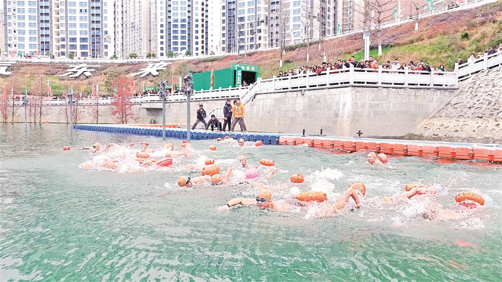 12月21日,陜西省第八屆漢江公開水域冬泳賽在紫陽縣月畔灣廣場水域舉行。當天,來自陜西、湖北、四川、重慶、河南、內(nèi)蒙古自治區(qū)的44支代表隊400余名運動員報名參賽。(儲茂銀 攝)