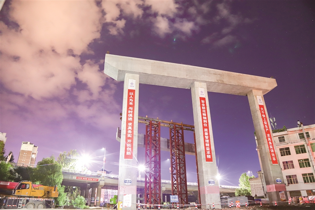 2024年8月10日,主線(xiàn)六號(hào)、七號(hào)墩柱蓋梁完成。