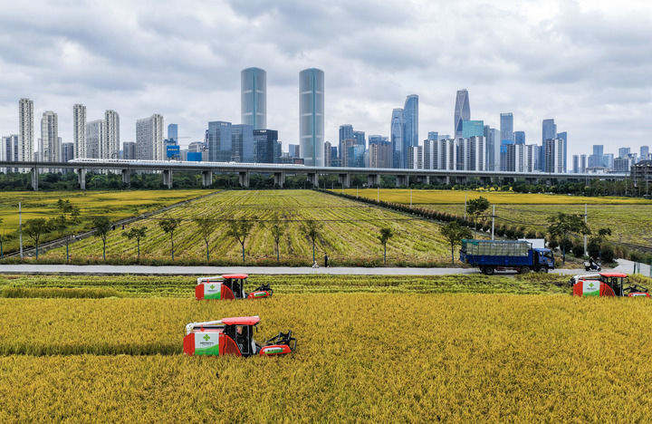 收割機(jī)在位于浙江杭州蕭山區(qū)世紀(jì)田園糧食功能區(qū)的稻田里收割水稻,遠(yuǎn)處高鐵列車飛馳而過(guò)(2025年10月21日攝,無(wú)人機(jī)照片)。新華社記者 徐昱 攝