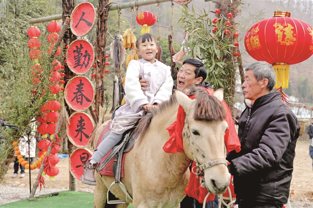 春節(jié)期間,寧陜縣城關(guān)鎮(zhèn)漁灣村舉行“回寧陜過大年”民俗展演。圖為游客體驗(yàn)?zāi)晁谆顒印顚?攝