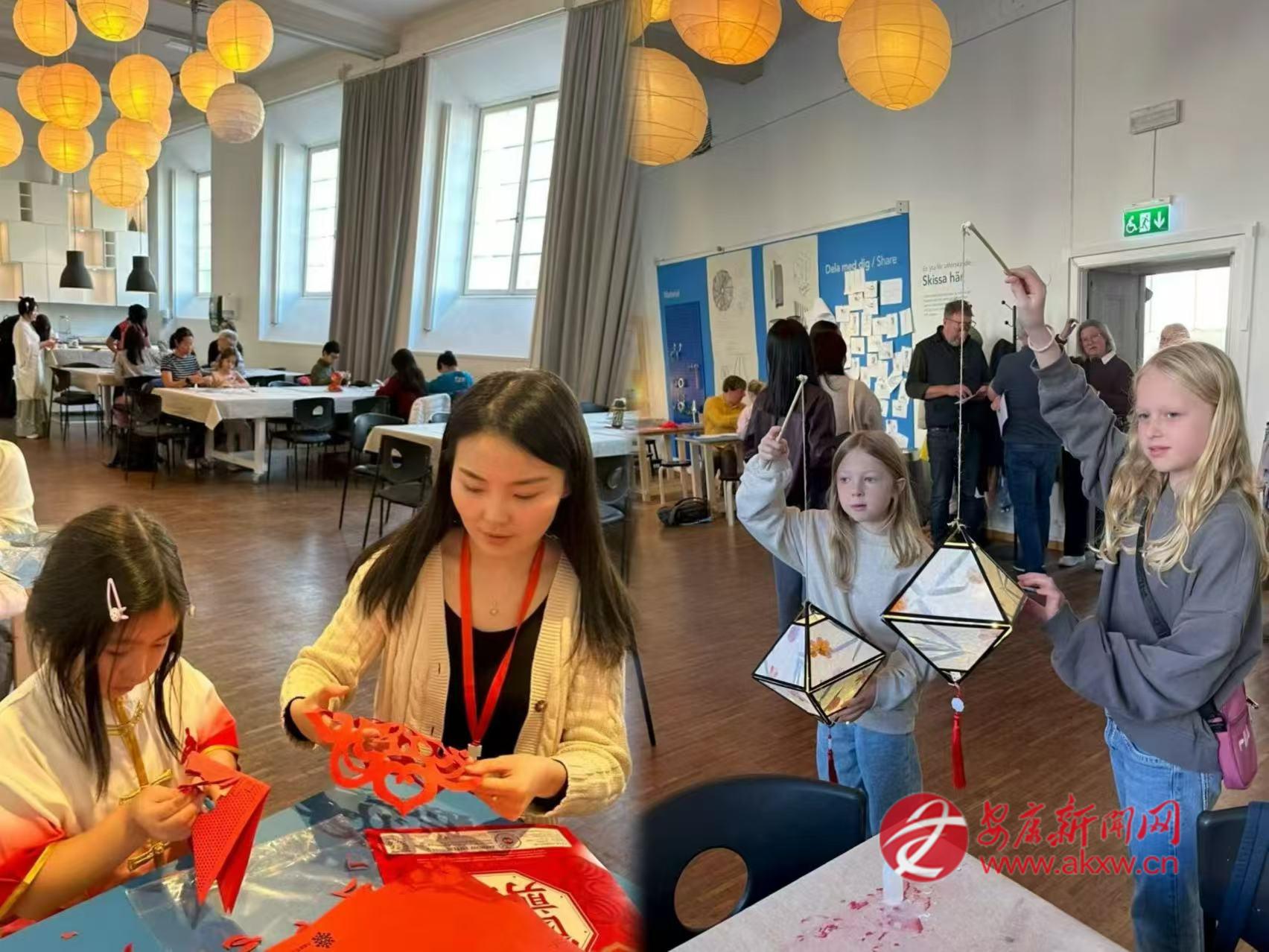 2025年中秋節(jié),邱萌受邀參加哥德堡總領(lǐng)館舉辦的文化活動(dòng),在哥德堡市立博物館的展廳里,她教當(dāng)?shù)睾⒆觽冏鰺艋\、剪剪紙。邱萌和孩子們一起用宣紙折疊成燈籠,讓瑞典人得以近距離觸摸中國(guó)節(jié)日。有人好奇地問(wèn)起中秋的月亮,她便講起嫦娥奔月的傳說(shuō),講起月餅的寓意,講起“千里共嬋娟”的詩(shī)句。博物館里點(diǎn)亮了許多盞燈籠,每一盞都映照著孩子們專注而好奇的臉龐。