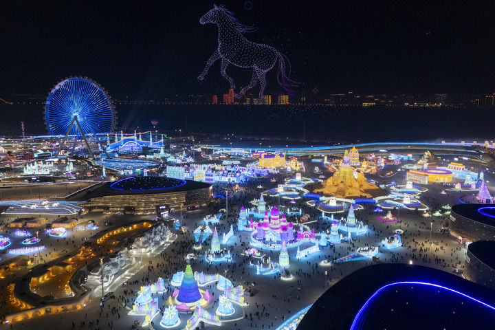 這是2026年1月5日拍攝的哈爾濱冰雪大世界園區(qū)的無人機表演(無人機照片)。新華社記者 張濤 攝