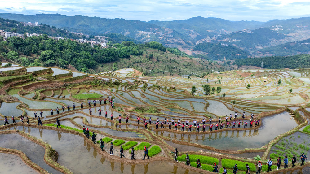 2025年5月2日,在云南省紅河縣甲寅村“開秧門”儀式上,村民身著民族服飾,沿著田埂踏歌而行(無人機(jī)照片)。新華社記者 胡超 攝