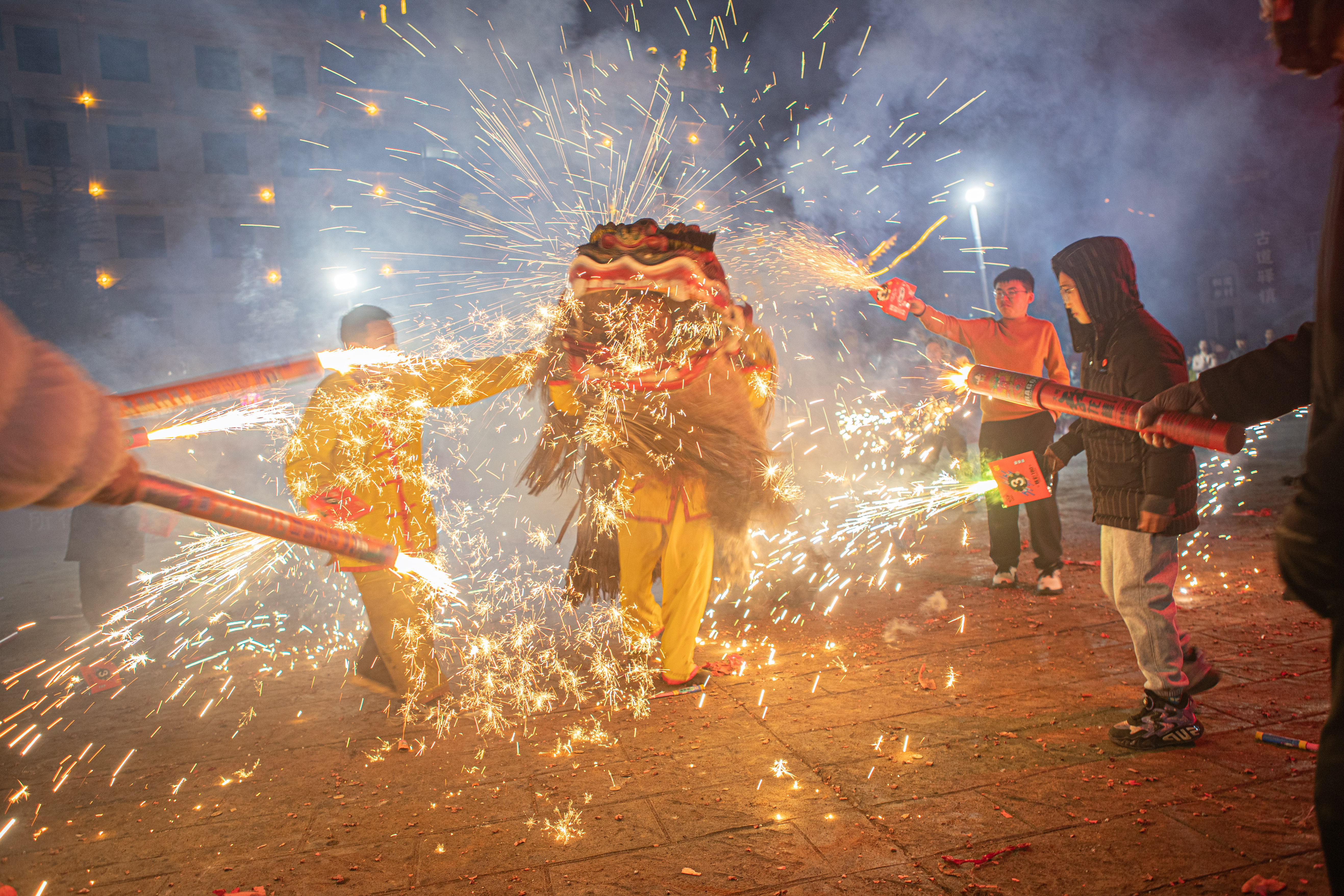 3月2日,漢陰縣雙河口鎮(zhèn)舉辦民俗非遺火燒獅子活動。尹正軍 攝