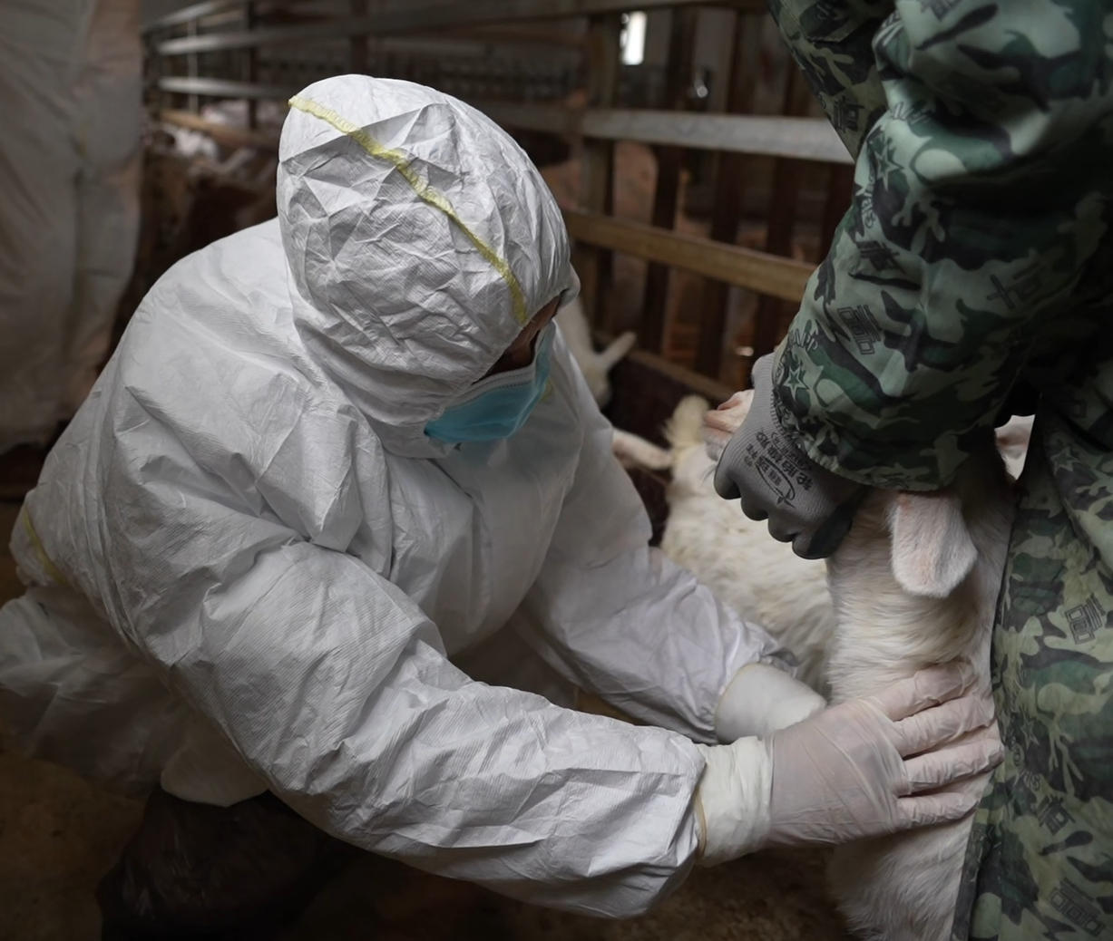 3月1日,在漢濱區(qū)關(guān)廟鎮(zhèn)唐淌村甲升興隆養(yǎng)殖合作社,畜牧獸醫(yī)師王峰身著白色防護(hù)服,蹲在羊圈邊,采集山羊血樣,為春季動(dòng)物防疫工作“精準(zhǔn)把脈”。