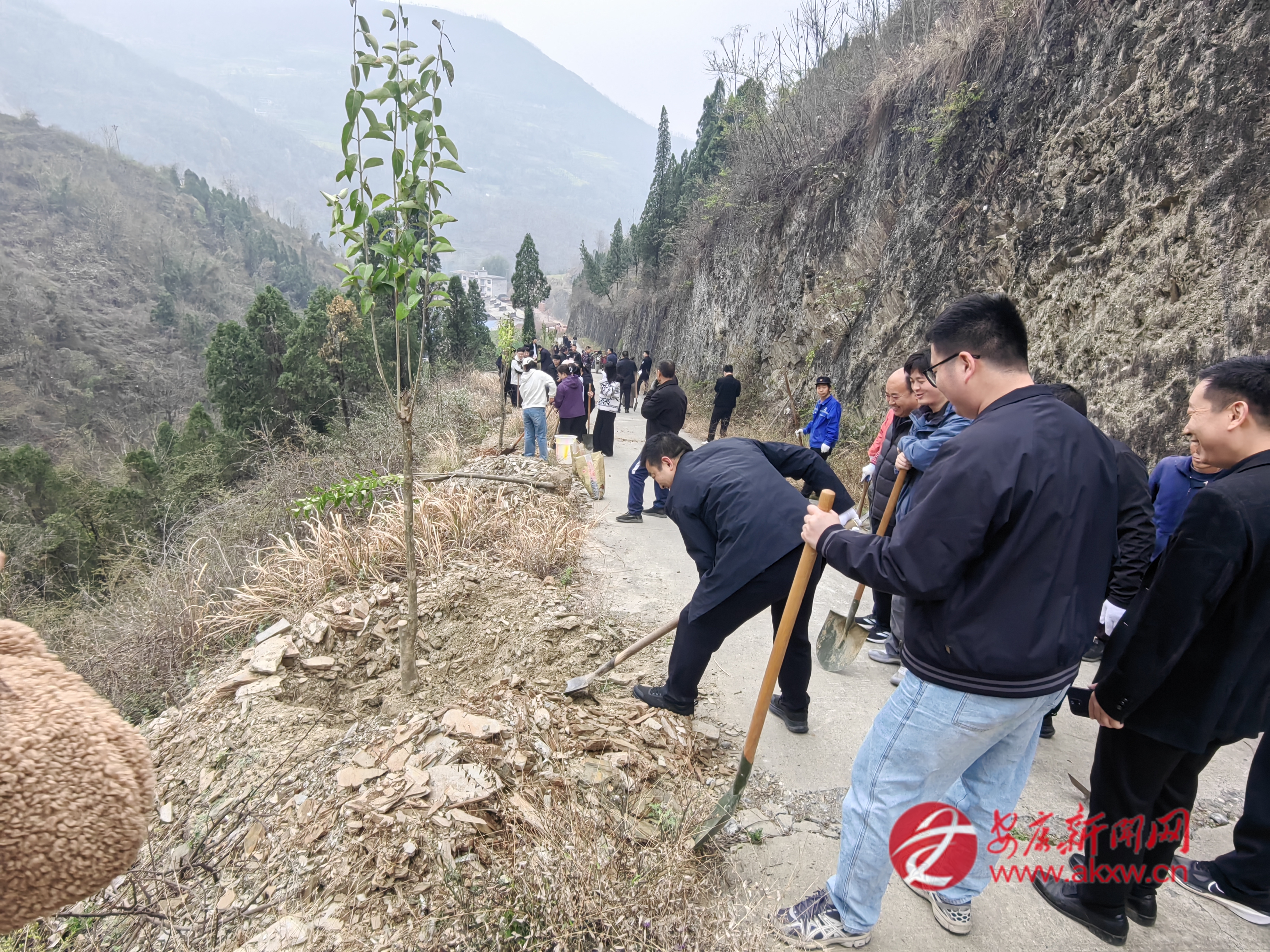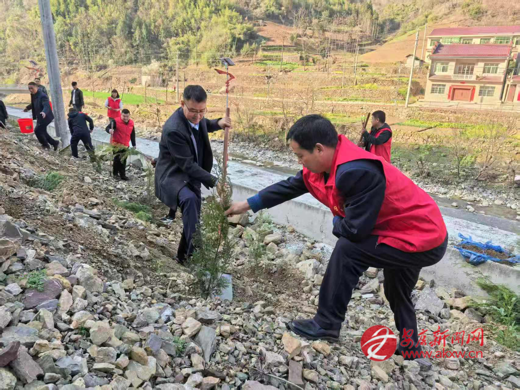 桐木鎮(zhèn)組織機(jī)關(guān)干部在青山村開展義務(wù)植樹活動(dòng)。