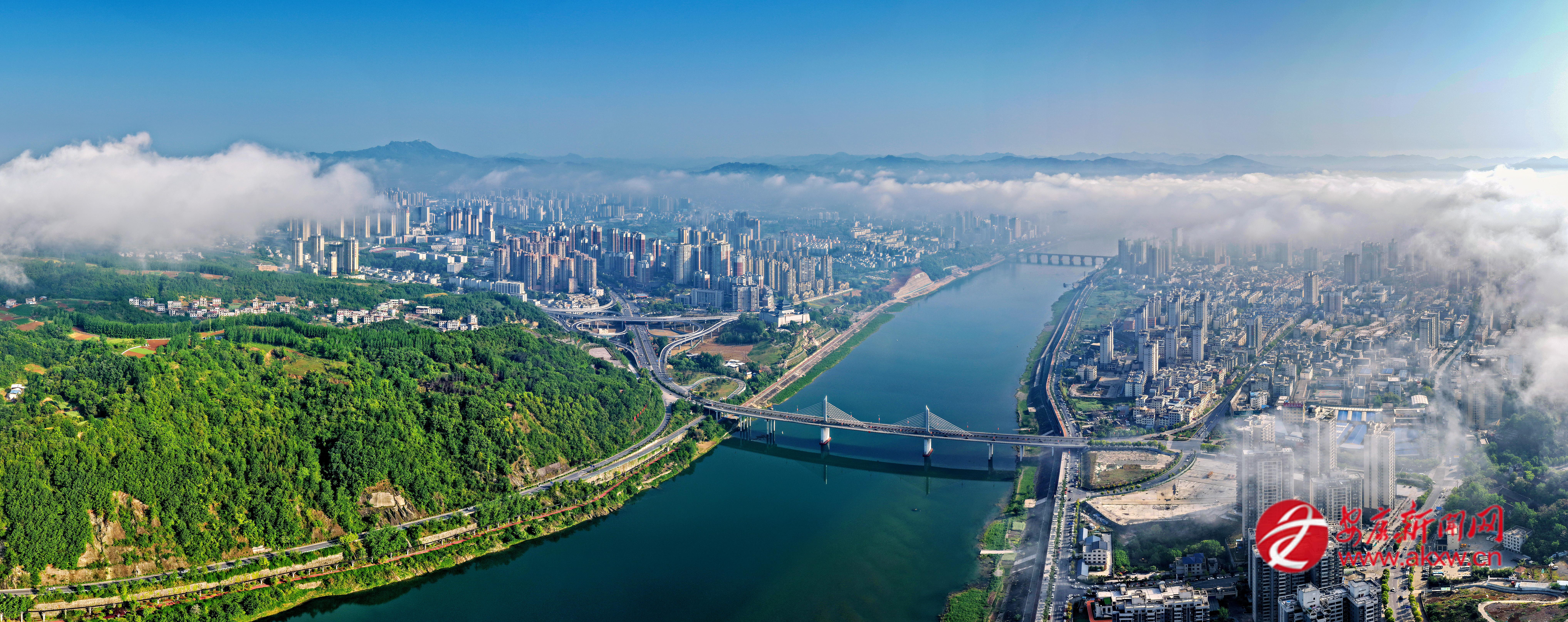 4月25日,鳥(niǎo)瞰我市中心城區(qū),一半是煙火人間,一半是山水美景,一幅“城在山水間,山水在城中”的美麗畫(huà)卷鋪展開(kāi)來(lái)。皮勇維 攝