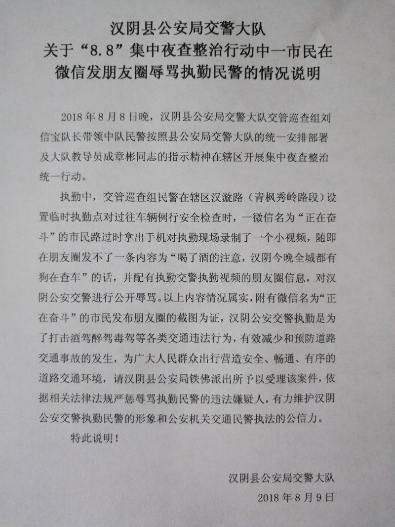 8月8日晚,漢陰縣公安局鐵佛派出所民警接到網(wǎng)友舉報,稱有一名網(wǎng)名叫“正在奮斗”的網(wǎng)友在朋友圈發(fā)布內(nèi)容為“喝了酒的注意,漢陰今晚全城都有狗查車”的辱警信息。接到報警后,鐵佛派出所民警立即開展行動,不到48小時,迅速查處一起尋釁滋事案件。經(jīng)調(diào)查,微信網(wǎng)友“正在奮斗”的真名叫郭某全,1985年出生,住漢陰縣城關鎮(zhèn)某小區(qū),正是發(fā)布該辱警信息的違法行為人。